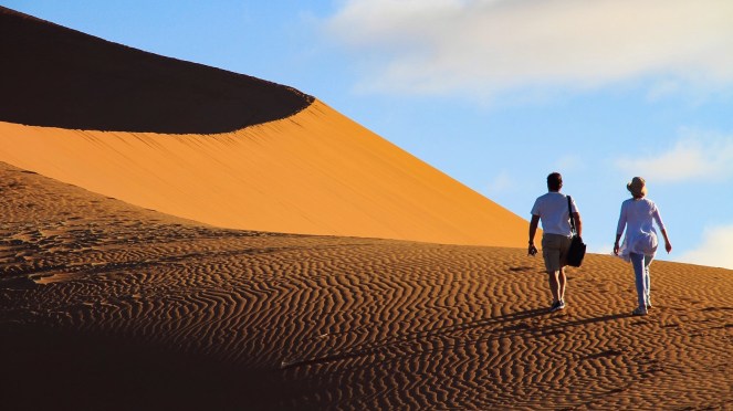 Namibiöknen med sina fantastiska röda sanddyner. Därtill Safari bland Afrikas många djur och en intressant befolkning varav 33 000 personer räknar sig till San-folket. Ett folk som till stor del än idag lever som jägare och samlare som talar khoisanspråk. Dessa språk har bland de mest komplexa ljudsystemen bland världens språk och är mest kända för sin användning av klickljud som konsonanter.
