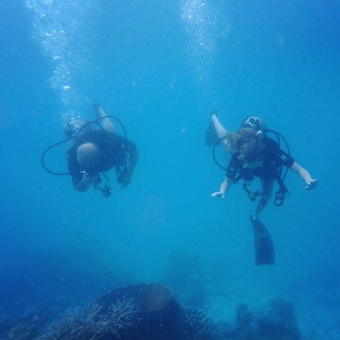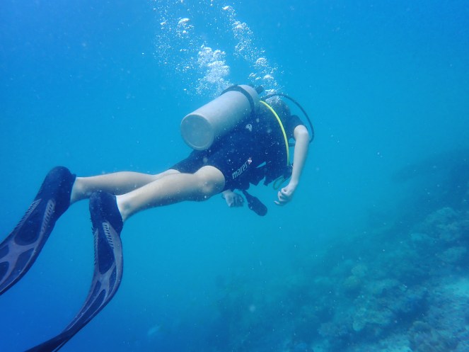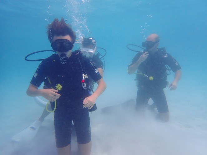 Så är det dags att med ganska klumpiga steg ta sig ner för en stege i det turkosa, ljumma vattnet. Vi ska ställa oss på knä på sandbotten. Men jag har för låg densitet. Flyter upp igen. Så jag får lite bly i västen och sedan fungerar det bra att göra övningarna.