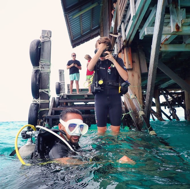 När vi kommer till Lankayan tillsammans med min bror och hans familj får vi snart reda på att han har planerat att göra ett prova-på-dyk med sina döttrar. De är 11 och 13 år gammla. Vi får frågan om vi vill hänga på. Minstingen, som fyller 14 år på Lankayan vill absolut inte prova att dyka och min sambo Anders har blivit av med sin mask med slipade glas. Troligtvis glömde vi den på Kuba. Utan slipade glas ser han tyvärr inte ett smack. Men Anton, 15 år, vill mer än gärna prova. Så då är vi totalt fem personer som anmäler oss till ett prova-på-dyk nästa morgon. Både jag och min bror har egentligen dyk-certifikat sedan förr, från var sitt håll, men ingen av oss har dykt på många år. Så det här blir som ett avrostningsdyk för oss, samtidigt som vi får följa med våra ungdomar när de för första gången provar att dyka med tuber. Priset är ungefär 1000 kr perperson.