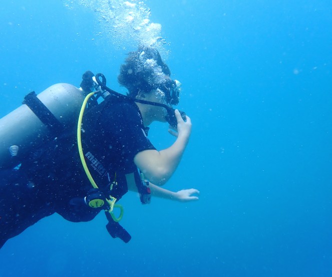 Så är det då äntligen dags att ta på sig all utrustning och gå ner i vattnet. På med väst och tub och in med regulatorn i munnen. Bit om bitstyckena på regulatorn. Andas i lugna djupa andetag. Som yoga. På med fenor och mask. Vi får en sista instruktion att aldrig själva fylla eller tömma västen på vatten. Detta sköter instruktören åt oss.