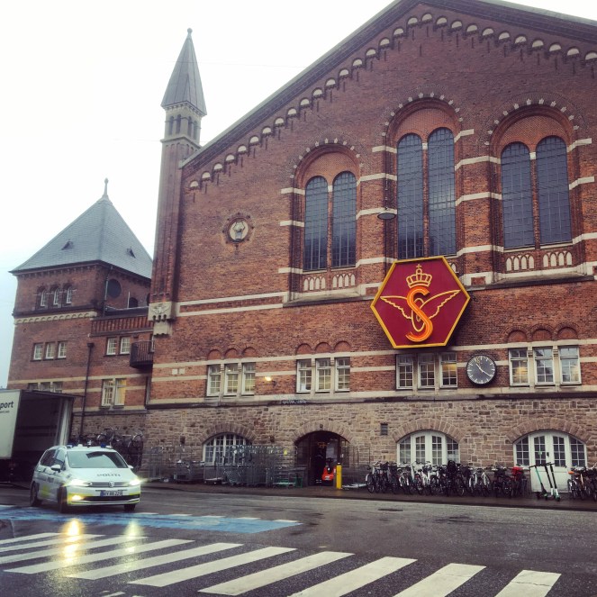 Det är förmiddag i Köpenhamn. Vårt hotell ligger bara 300 meter från centralstationen som på danska heter København Hovedbanegård. Vi har tagit det lugnt på morgonenn och avstår därför ifrån att köpa till hotellfrukost. Istället checkar vi ut och går till huvudbangården för att få lite frukost i oss.