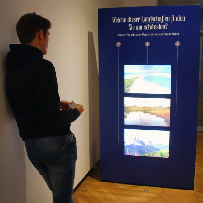 Ytterligare en skylt låter oss välja mellan tre landskap. Ett med vita stränder och turkost vatten i något tropiskt land, ett med ett vattenhål på savannen där ett träd speglar sig i vattnet och ett antal lejon ligger på lur och sist ett alplandskap med vackra berg och rallarrosor i förgrunden. Det här är ett intressant val för mig som fascineras så av vackra platser. Vilken ska jag välja? Vilken har andra valt? Jag är nästan säker på att de flesta gillar de vackra stränderna, men vänta, vi är i Tyskland. Kanske gör landets närhet till Alperna att de föredrar berg? Nåväl efter stor tvekan mellan de tropiska stränderna och det afrikanska safarilandskapet väljer jag själv hav och strand. Döm om min förvåning när jag sedan ser hur andra röstat. Det afrikanska landskapet är populärast. Det hade jag aldrig trott!