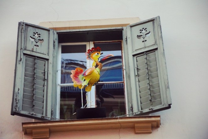 Bilden föreställer en skulpterad fantasifågel i ett fönster i Bolzano.