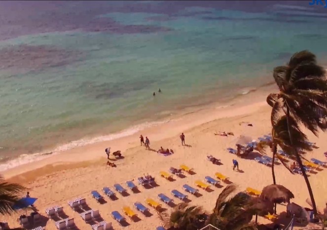 På den här stranden på Yucatanhalvön rör sig fortfarande människor, men många solstolar gapar tomma, något som tydligt framgår av bilderna från den webbkamera som jag hittade.