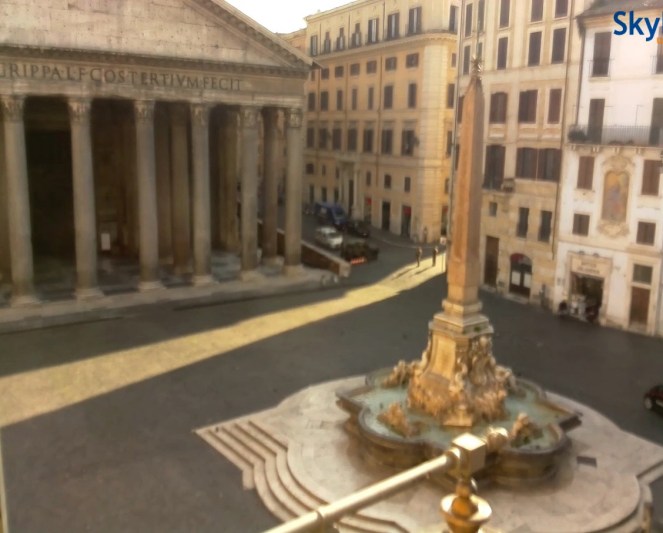 Det här är en av de allra häftigaste sevärdheterna i Rom. En antik byggnad som än i dag används för sitt ursprungliga ändåmål. Ett tempel. Först för romarikets många gudar och sedan för kristendomen. Här utanför brukar det vara trängsel. Där brukar också stå ett par tre personer utklädda till romerska legionärer, som lever på att turister får fotografera sig tillsammans med dem. Men nu är platsen nästan helt öde.