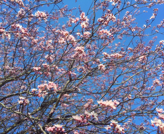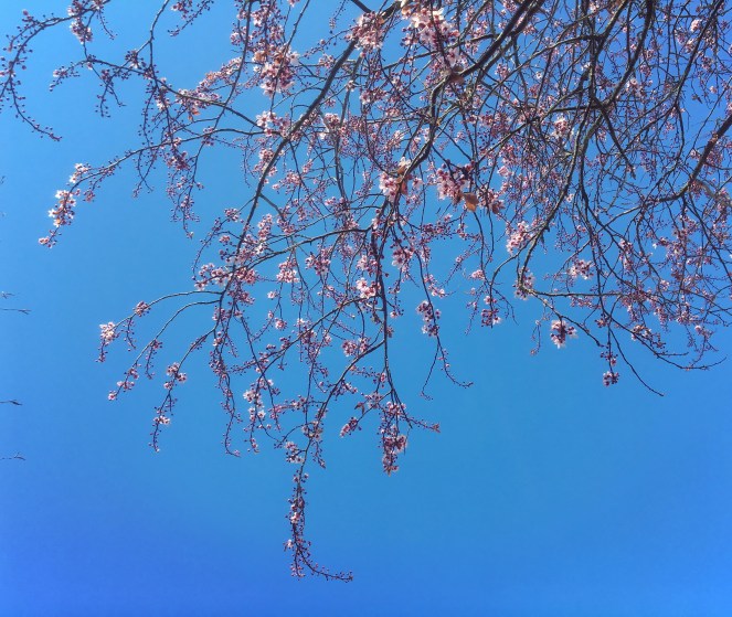 Men visst blommar de här körsbärsträden ovanligt tidigt i år? Jag hittade dem i Kristianstad idag. Rosa blommor mot den blå himlen. Våren är så vacker som den kan vara. Men jag känner missmod. Får man gå i ide nu? När våren är som vackrast?