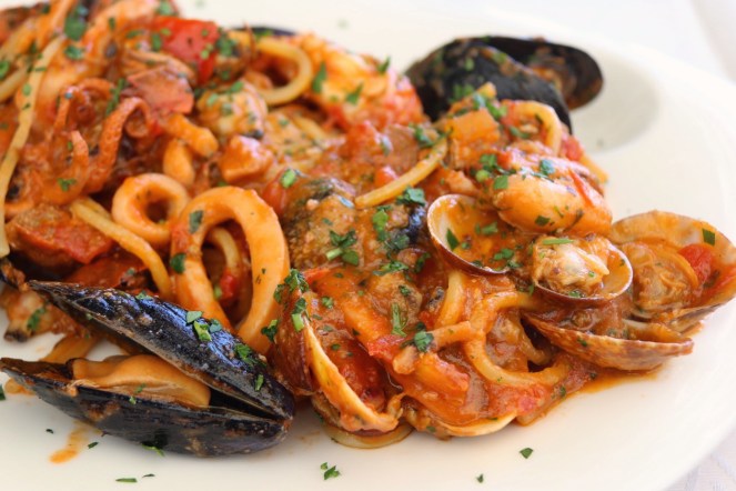 Vi var här och åt i augusti 2017. Vår familj på fyra personer delade på en lufttorkad skinka med melon, en spaghetti vongole, en spaghetti seafood, två vatten, tre iste, två öl och en glass.