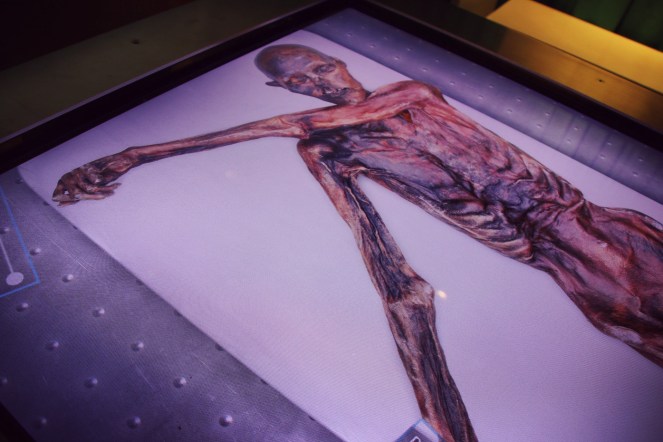 Idag ligger den mumifierade kroppen i ett isrum med ett litet glasfönster där besökarna kan kika in. Fotoförbud råder i just detta rum. Men det finns också en vaxdocka som är en tolkning av hur Ötzi kan ha sett ut som livs levande. Den är det fullt tillåtet att fotografera.