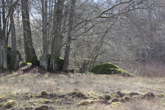 Så passerar vi en grind och går genom en hage. Det är här vi ser en ekorre och många fåglar. Björkarna har börjat få ”musöron”, som de första små bladen kallas. Enar, ekar och alar ser vi också. Marken är bitvis bökad av något djur.