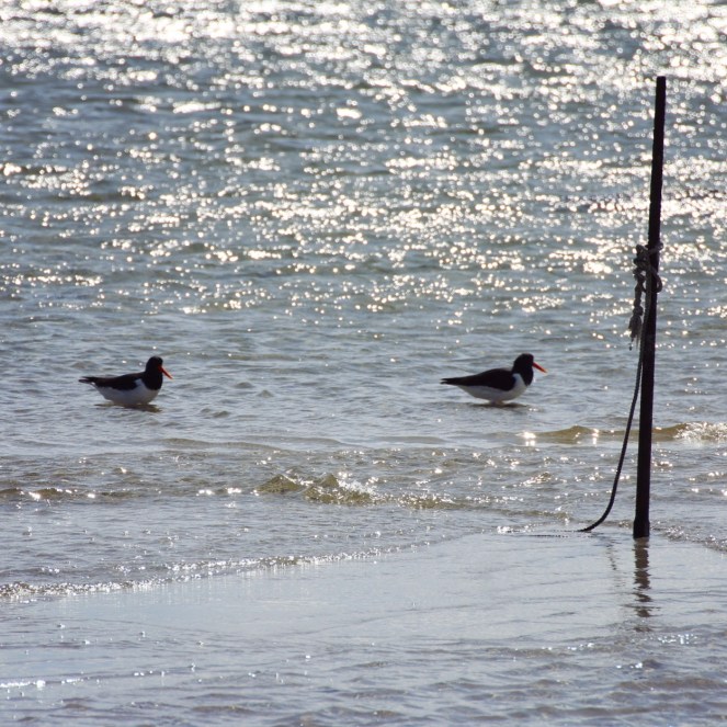 Vi parkerar vid Dagmars Hamnkrog intill Hälleviks rökeri och går sedan en kort promenad längs viken. Vattnet står ganska lågt och det är därför mycket grunt. Det gör att vågorna inte blir så jättehöga, trots att det blåser. Ute i vattnet ser vi ett par skrattmåsar som bytt till sina svarta sommarfjädrar på huvudet. Vi ser också två strandskator som promenerar runt i det grunda vattnet. De är också ett vårtecken. Flyttfåglar som de är.