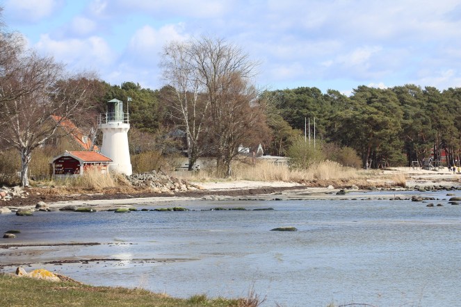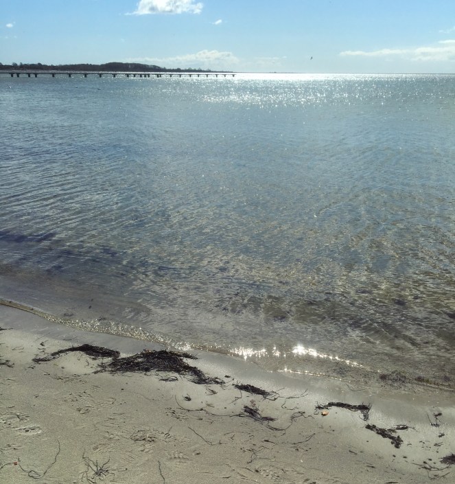 Vi promenerar vidare till själva stranden. Här är långgrunt. Bryggan på platsen är delvis nedmonterad för vintern och delarna ligger i travar på stranden. Här kommer att vara gott om barnfamiljer i sommar, men den här aprildagen är det bara vi och ytterligare ett sällskap på hela stranden.