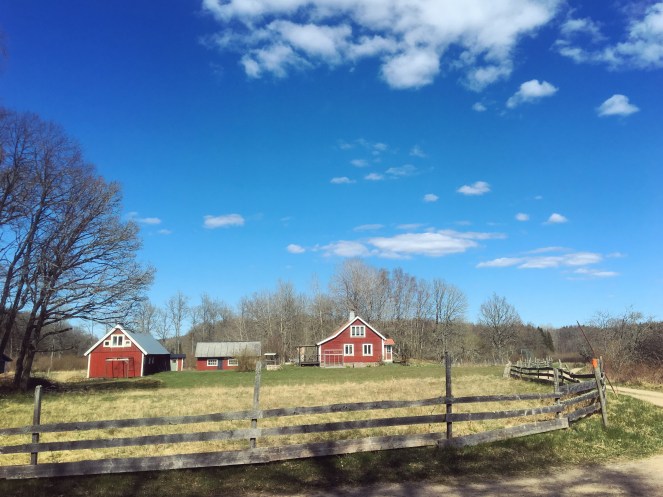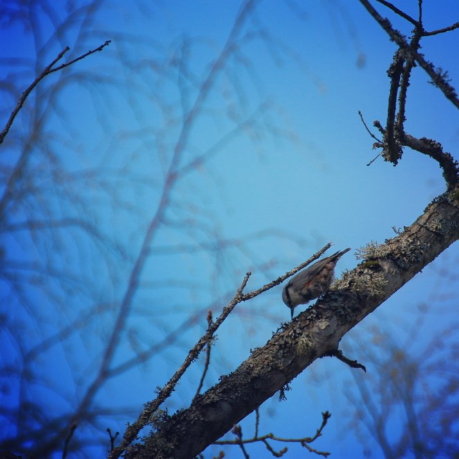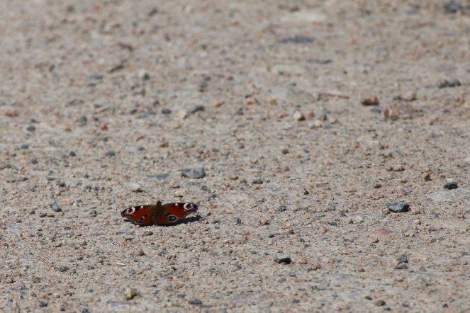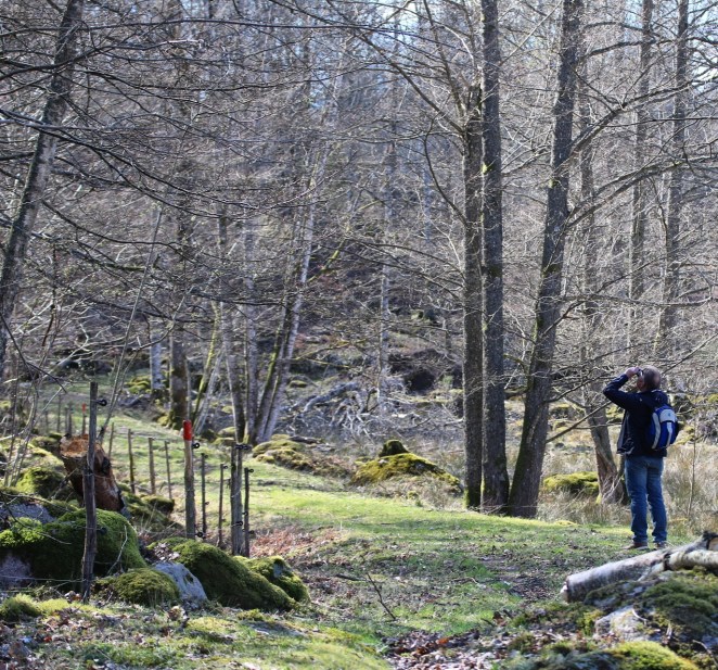 Vi promenerar över en bäck och en citronfjäril vinglar i vinden. Det är ett ganska stenigt landskap. Stenmurar och flyttblock. Fåglar kvittrar och gäckar oss genom att ständigt flytta sig mellan träden. En lönn har precis börjat få små gula blommor på en gren mot den blå himlen. Stigen slingrar sig fram genom bokskogen.