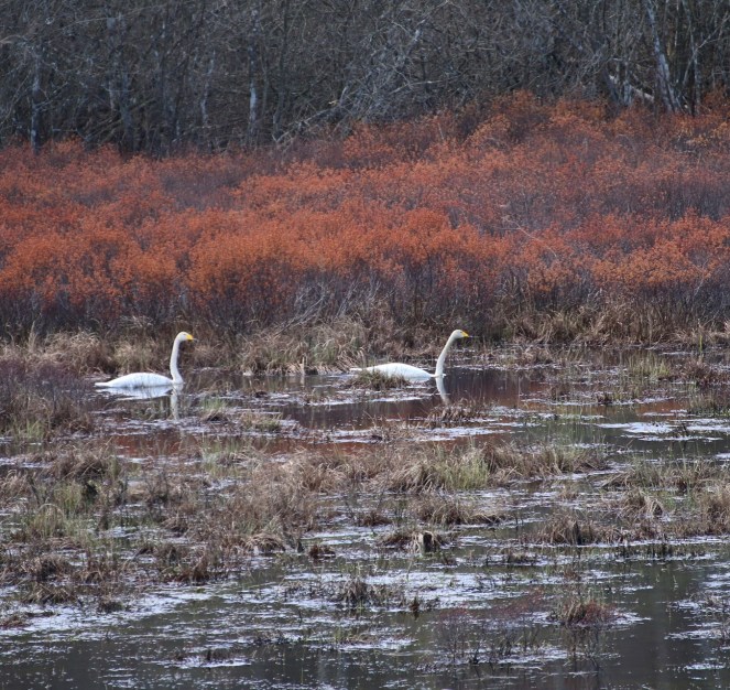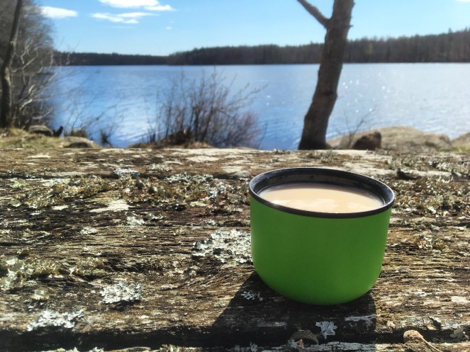 Vi går längs en sluttning. Nedanför, på vår högra sida syns en våtmark. En häger ger sig snabbt av när vi kommer. Men ett par sångsvanar blir kvar för oss att titta på. Våtmarken övergår i öppet vatten. Det är en vik av Norra Öllesjön. Vi hittar ett gammalt fikabord en bit ifrån stigen, precis vid vattnet. Det är inte utmärkt på någon karta och alldeles övervuxet av lavar. Men det är ändå en utmärkt och vacker plats för en fikapaus. Vi dricker te med mjölk från termos och äter var sin ostmacka. Över sjön ser vi då och då fåglar som vi inte kan artbestämma.