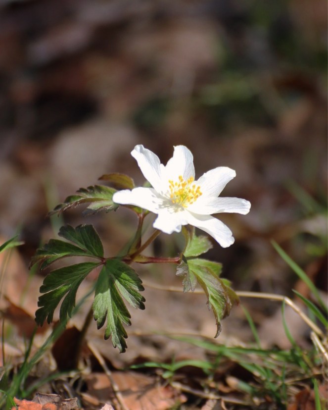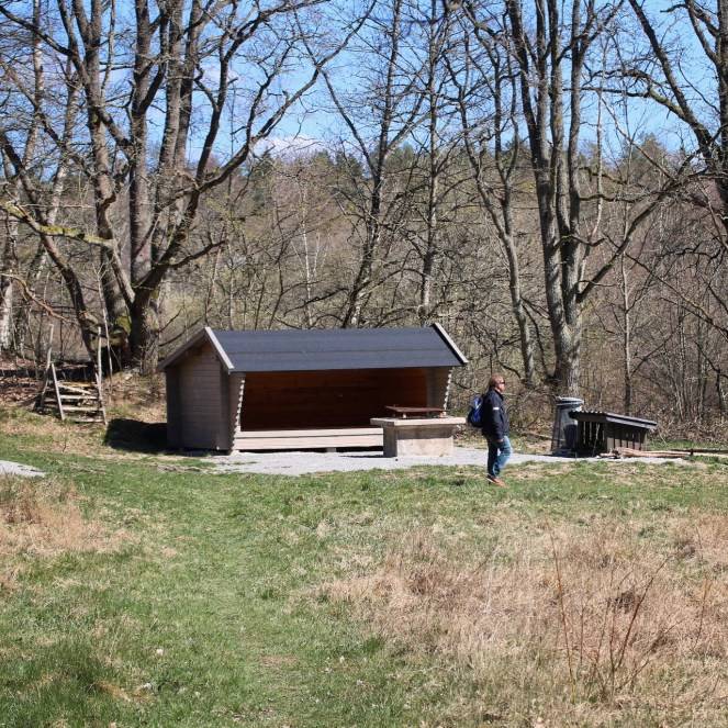 Efter en stunds stillhet vandrar vi vidare. Nu hör vi storlommens vackra men sorgsna rop över sjön. Vidare genom en vitsippebacke. Och så kommer vi till ett vindskydd och en grillplats där det enligt kartan, i min bok om Blekingeleden, också ska finnas någon form av toalett eller torrdass. Men det gör det inte.