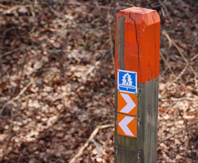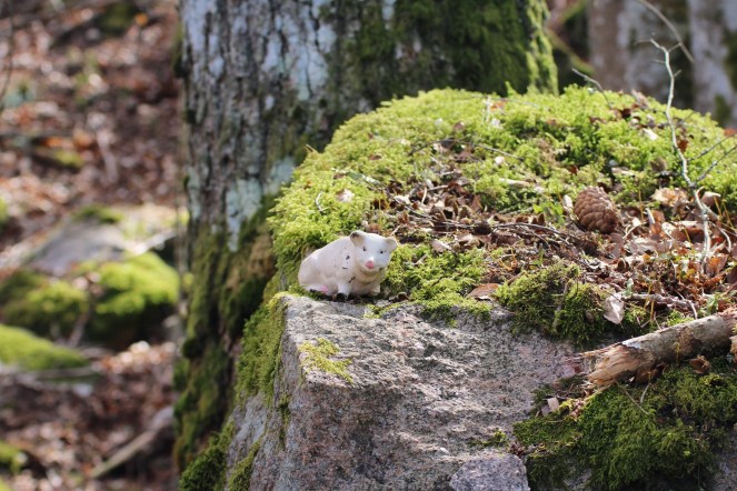 Härifrån följer vi orange markering för Blekingeleden österut, först en liten bit längs vägen och sedan in på en gammal skogsväg. På en sten sitter förvånande nog en porslinsgris och tittar på oss.
