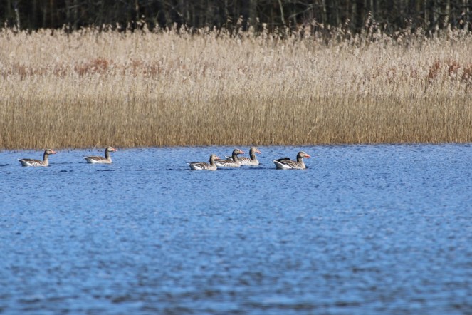 Det är några grågäss på sjön här, som oroas något av vår närvaro.