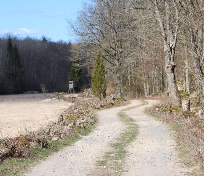 Där den markerade stigen genom naturreservatet gör en skarp sväng åt vänster fortsätter vi istället ut på stora vägen och följer sedan den rakt fram till P-platsen.