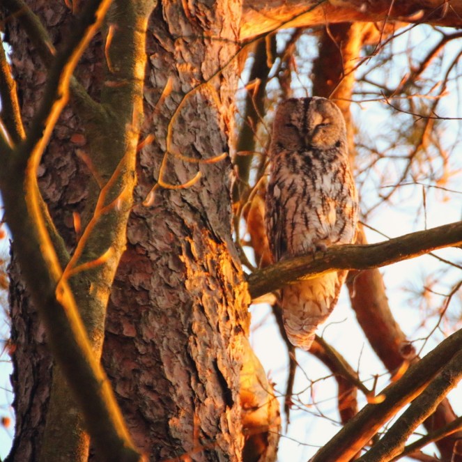 Vi höll bara viss social distans men ugglan uppträdde ändå med förvånansvärt lugn. Kisade bara mot oss lite med ena ögat lite halvöppet sådär.