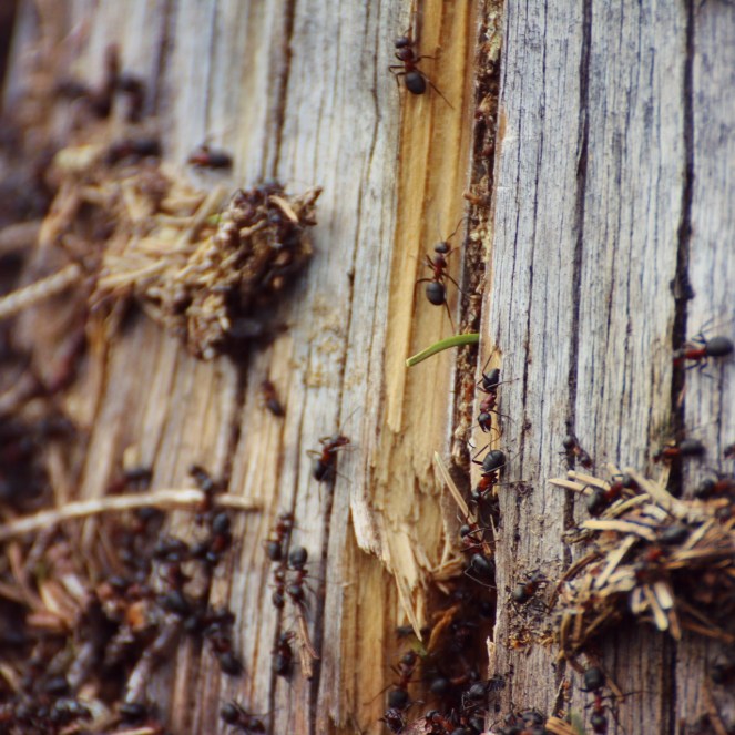 Runt en gammal död trädstam har myrorna byggt en jättestack. De använder samma stig som den vi går på för sitt strävsamma arbete.