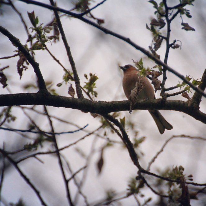 När vi passerar en bäck hittar vi en skylt med en karta. Det ska visa sig finnas sådan skyltar på fler platser längs vandringen. Ännu en granskog. En och annan vitsippa på marken. Stigen kommer ut på en skogsbilväg och de mörkblå markeringarna fortsätter längs den. Ännu en liten björkskog. Vi ser ett par gölar på avstånd mellan träden.