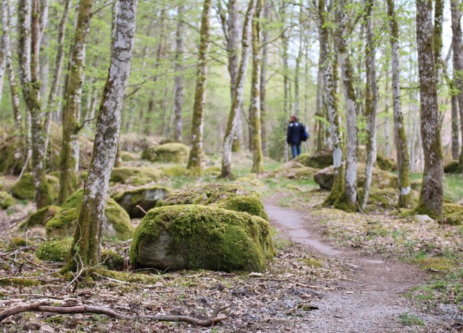 Så kommer vi till slingans första hygge. Det är tyvärr ganska många så kallade föryngringsytor längs den här vandringen. Lite synd, för i övrigt är den fin. Efter en kortare bit genom granskog och ännu ett hygge kommer vi till en björkskog. Tunna björkstammar och skira björklöv så långt ögat når.