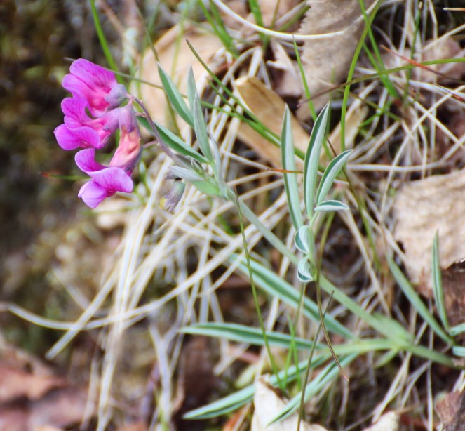 Plötsligt är marken nästan täckt med små lila blommor. Jag känner igen dem som en sort som ofta växer vid gamla torp och mycket riktigt har vi nu kommit till ännu en torpruin. Kryddatorpet heter detta. Väl hemma, när jag skriver detta, minns jag att de fina blommorna heter vintergröna.