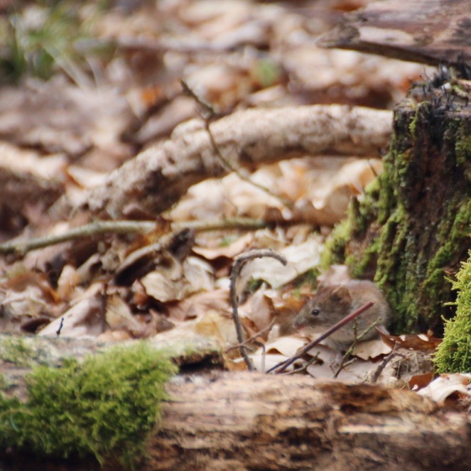 Vi får syn på en fågel här. En svartvit flugsnappare. Strax passerar vi sedan en skylt som markerar Knutatorpet. Idag finns bara en ruin kvar. Det är den första av flera torpruiner som vi ska se längs slingan. Jag hör något som prasslar bland de torra boklöven på marken och stannar till. Det är en liten mus som sitter vid en stubbe.
