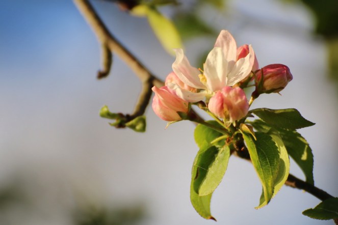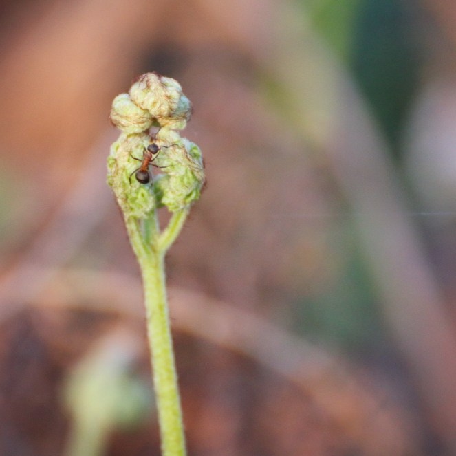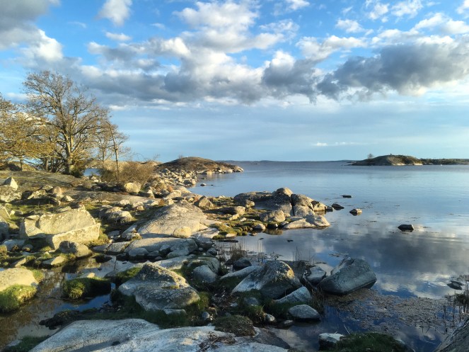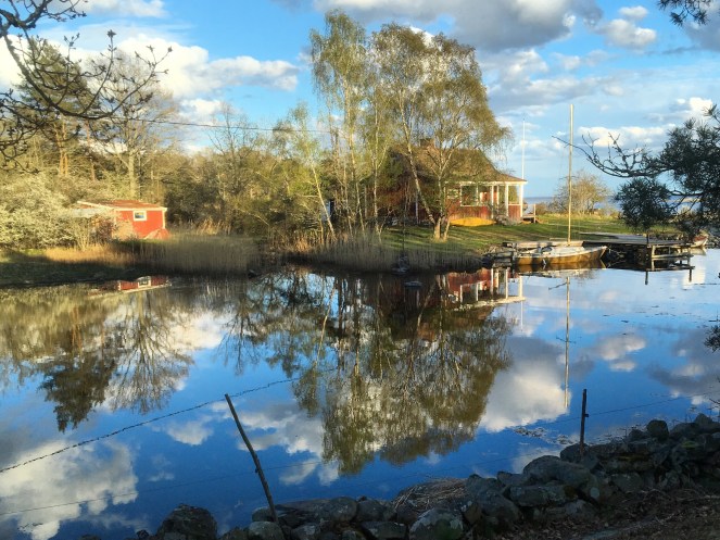 Här växer en vildapel och också många slånbuskar, som blommar nu. Små vackra vita blommor i överflöd. En sångsvan gör sig stor och glider långsamt över fjärden medan solen går ner bakom bruket. Småbåtshamnen och badplatsen är tomma så när på en parkerad bil. Några ormbunkar är i färd med att väckla ut sig. De blivande bladen ser ut som små knyten. Och på vart och ett av knytena sitter en eller två myror.