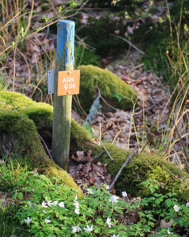 Vi går över vägen, öster ut och vandrar alltså slingan medsols. Leden är markerad med ljusblå färg på stolpar. Och en orange markering att den ingår i ARK 56. Första biten går stigen längs en stenmur genom något som liknar ett mellanting mellan en skog och en hage. På marken blommar många vitsippor så här i slutet av april. Träden är mycket ek, en och tall. Och en och annan björk som fått musöron nu. På andra sidan stenmuren har vi utblickar över ett jordbrukslandskap med åkrar i förgrunden.