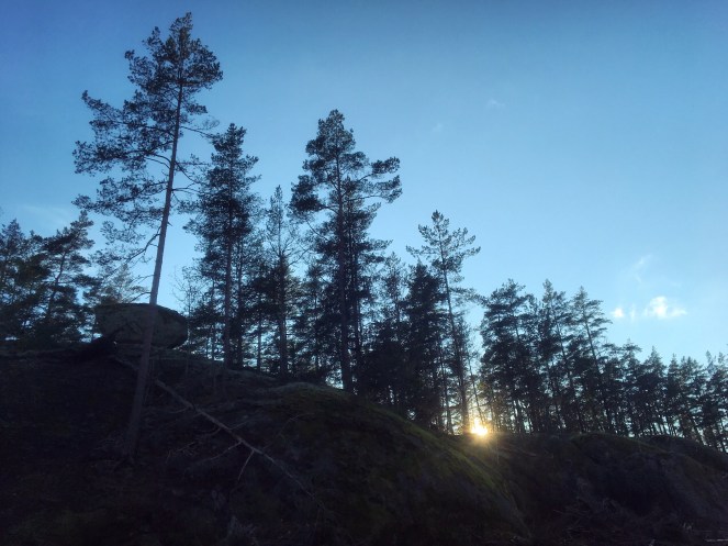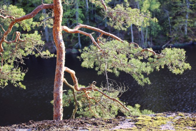 Där stigen tar slut finns en klippa som skjuter ut, med en grillplats under. Vi vänder här och följer istället en vag stig upp på berget. Här växer mest tall och en del blåbärsris. Det är bitvis inte helt lätt att gå med en stor kamera i ena handen. Men det fungerar. Vi kommer upp på berget och utsikten är vacker. Vi följer stigen uppe på berget till ytterligare en utsiktsplats innan vi fortsätter framåt, men neråt. Vi kommer ut på vägen en bit längre upp och följer sedan den tillbaka mot bilen.