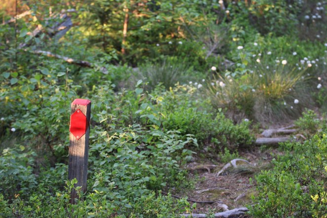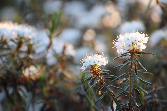 Vi vandrar rödmarkerad slinga motsols genom reservatet. Men vi kortar sträckan och väljer vit genväg uppe där skogen tar vid. Då har vi redan gjort en avstickare in mot det spegelblanka Västragylet där porsen nu blommar för fullt i stora vita klasar.