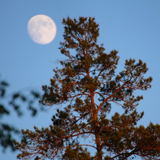 Månen syns bakom en talltopp.