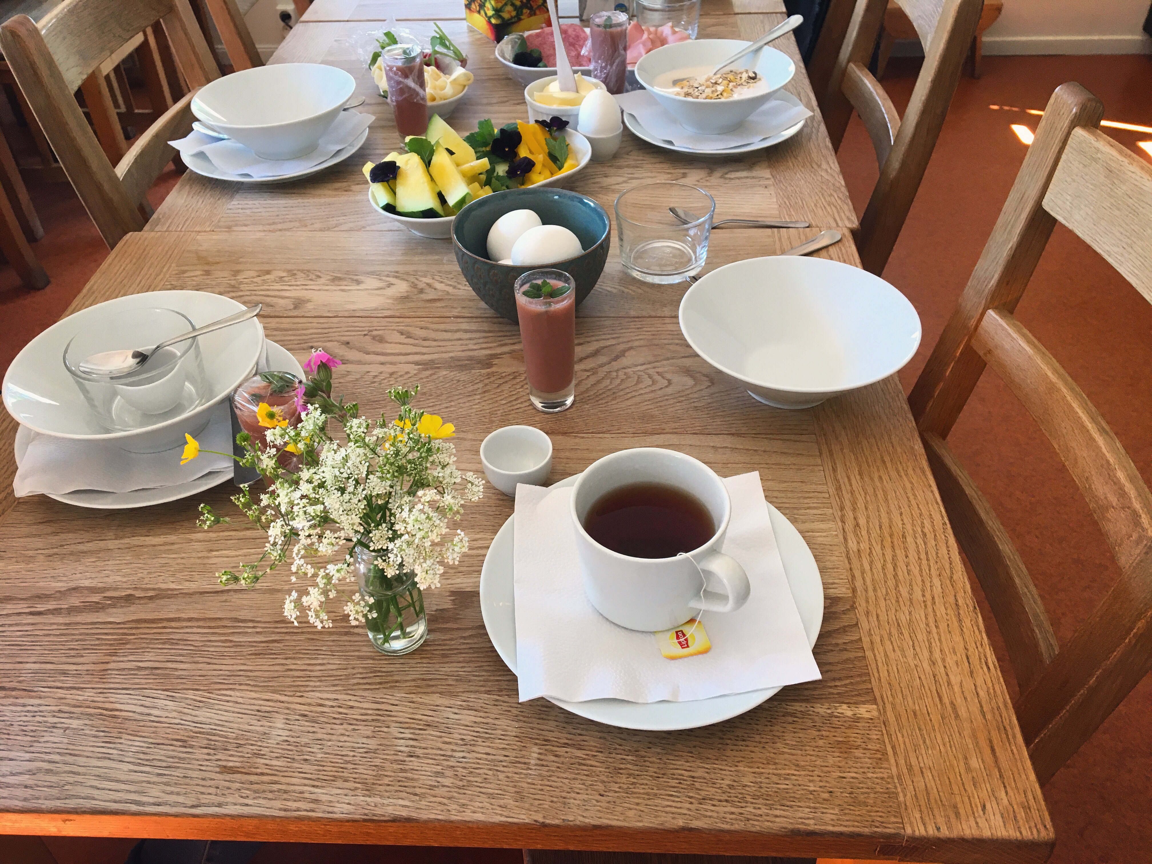Ensamma i matsalen har vi också varit vid frukosten, som vi köpte till i vår bokning. Trots att vi var de enda frukostgästerna de här dagarna ordnades det jättefint för oss på fat i ett av kylskåpen. Traditionell frukostbuffé serveras nog ändå inte nu. På grund av coronan.