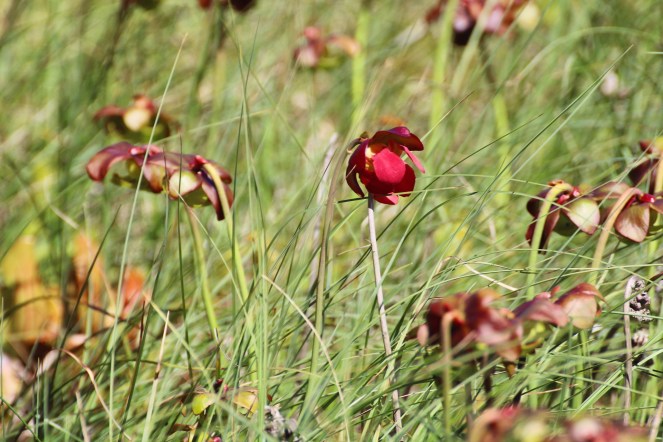Det är nämligen både gungfly och väldigt blött i den lilla mossen där det växer stora mängder av den köttätande flugtrumpeten.