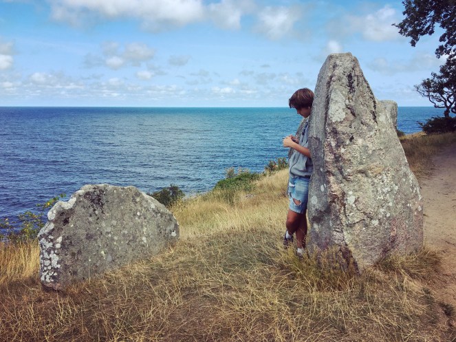 I årtusenden har havet eroderat den steniga kusten och skapat djupa raviner in i berget. Det som återstår nu är spännande formationer med robusta granitpelare och djupa grottor (som vi hoppade över) – så kallade ”ovne”, ”ugnar”, som tillsammans utgör Helligdomsklipperne. Klipporna är upp till 20 meter höga och de är uppkallad efter en helig källa som i forntida rann fram vid foten av klipporna.