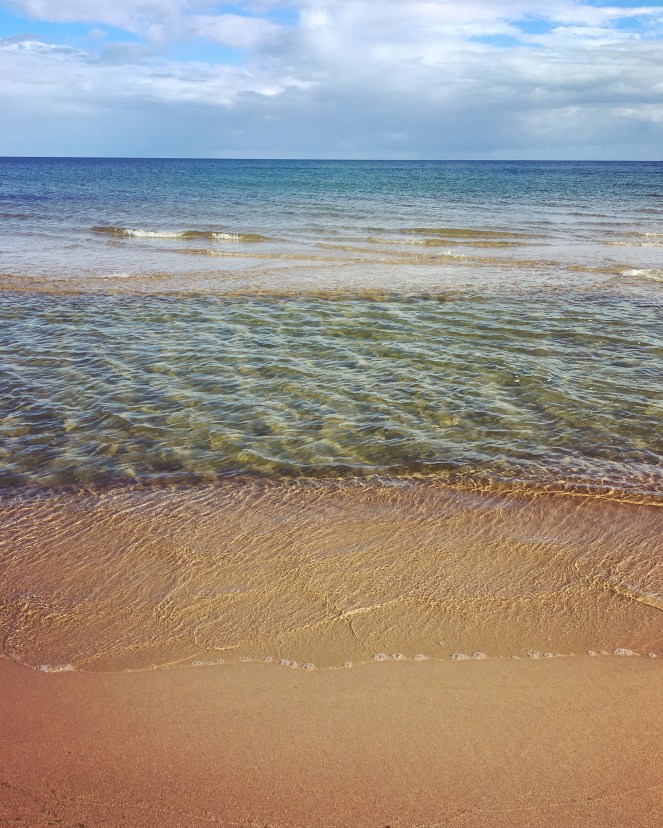 Just den här dagen är vattnet ovanligt klart, det bekräftar en av våra vänner när jag frågar. Vi är nämligen helt nära Helgeåns utlopp i havet och åvatten är som bekant mörkare än havsvatten. Men just idag påverkar inte detta åvatten färgen på vattnet vid stranden precis intill åns utlopp.