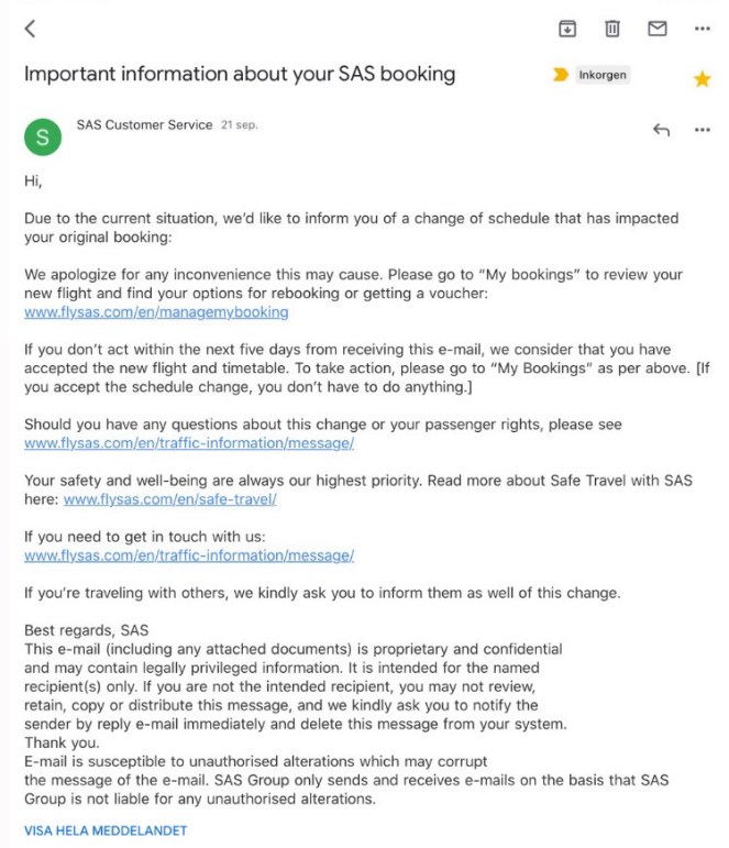 Klockan 19:07 kommer mycket riktigt ett mejl från bokningssystemet Amadeus. Bokningsnummer, våra namn och följande information: ”CANCELLED 21SEP STOCKHOLM MON YOUR RESERVATION HAS BEEN CANCELLED. PLEASE SEE WWW.FLYSAS.COM FOR INFORMATION ABOUT BAGGAGE ALLOWANCE AND OTHER RELEVANT TRAVEL INFORMATION CLICK THE FOLLOWING LINK TO ACCESS YOUR ONLINE ITINERARY.