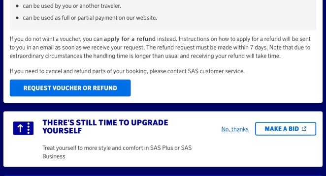 ”Planerar du en resa med oss längre fram då kan du behålla värdet av din ej använda biljett i form av en SAS Travel Credit Voucher. Vår Voucher gäller i ett år, täcker värdet av ej använda biljetter, gäller till alla SAS destinationer och kan användas både av dig själv eller någon annan. Besök vår hemsida klicka på mina bokningar och ange ditt bokningsnummer samt efternamn Här hittar du också våra allmänna transportvillkor.”