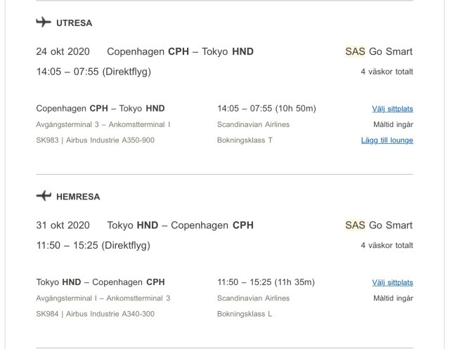Den första och viktigaste länken går dock till min bokning. Jag loggar in där. Jag förstår så mycket som att det gäller vår planerade resa till Tokyo senare i höst. Men informationen på den här sidan är i övrigt helt obegriplig. Något är inställt men vad? Utresan eller hemresan eller båda?