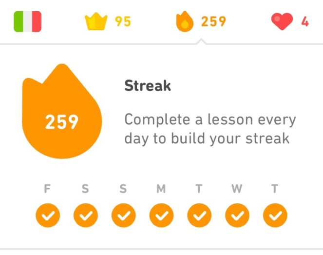 Duolingo är en app för språkinlärning som är grattis i sin grundform – reklamfinansierad – och som jag tydligen laddade ner på kvällen den 30 september 2019. Att jag vet det beror på att jag fick ett mejl exakt ett år senare, som gratulerade mig på årsdagen. Bilden ovan är ifrån det mejlet.