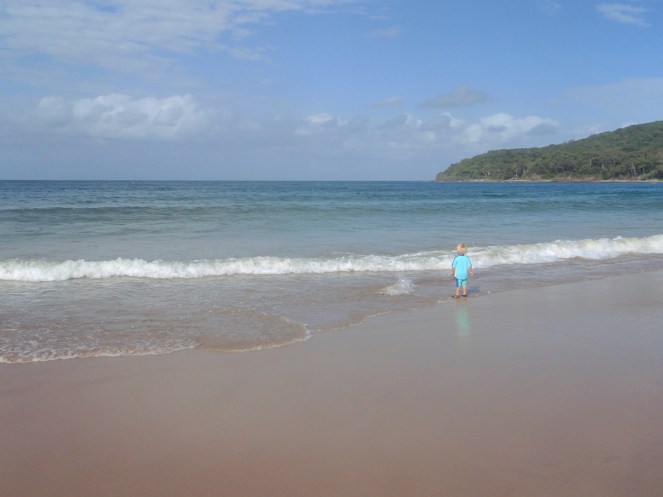 Den lille och havet. Så fin bild på Albin i turkost och ett stoooort hav.