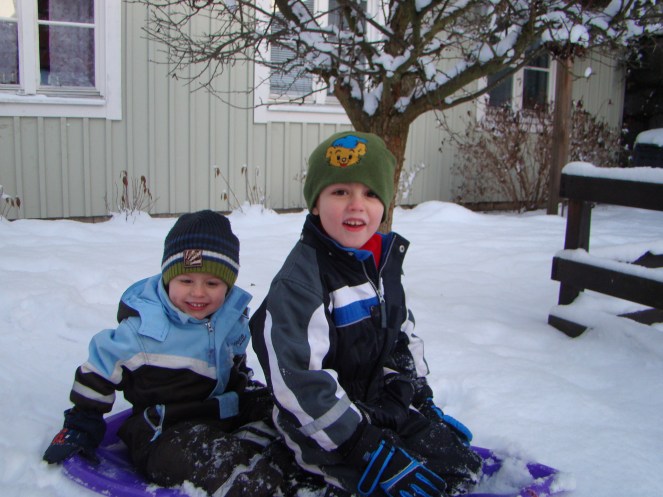 Den 22 december 2009. Snö här hemma på innergården. Och pulkaåkning. Till och med en sväng på stan i pulka innan det var plogat, sandat och saltat. Kul för de som då var små!