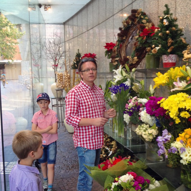 Vi köpte den nämligen i Sydney på självaste julafton 2012. På bilden nedan syns min familj i den lilla blomsteraffär där vi köpte granen. Det är den som står där på hyllan längst upp till höger. Vi hade den sedan på vårt hotellrum för att bättra på julstämningen lite. Och vi tyckte sedan att den var så fin att den fick följa med hem.  Vi köpte en extra resväska i Sydney, billigt på en kinesisk marknad, för att kunna ta hem den och ett kricket-set som barnen fått i julklapp.