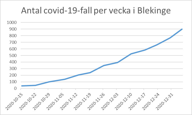 I länet som helhet ser det ännu mer dramatiskt ut. Fler än någonsin ligger inlagda på sjukhus för covid-19 både i landet som helhet och i Blekinge. Här fortsätter fallen bara att öka och vi är nu uppe i 900 personer per vecka som får diagnosen: