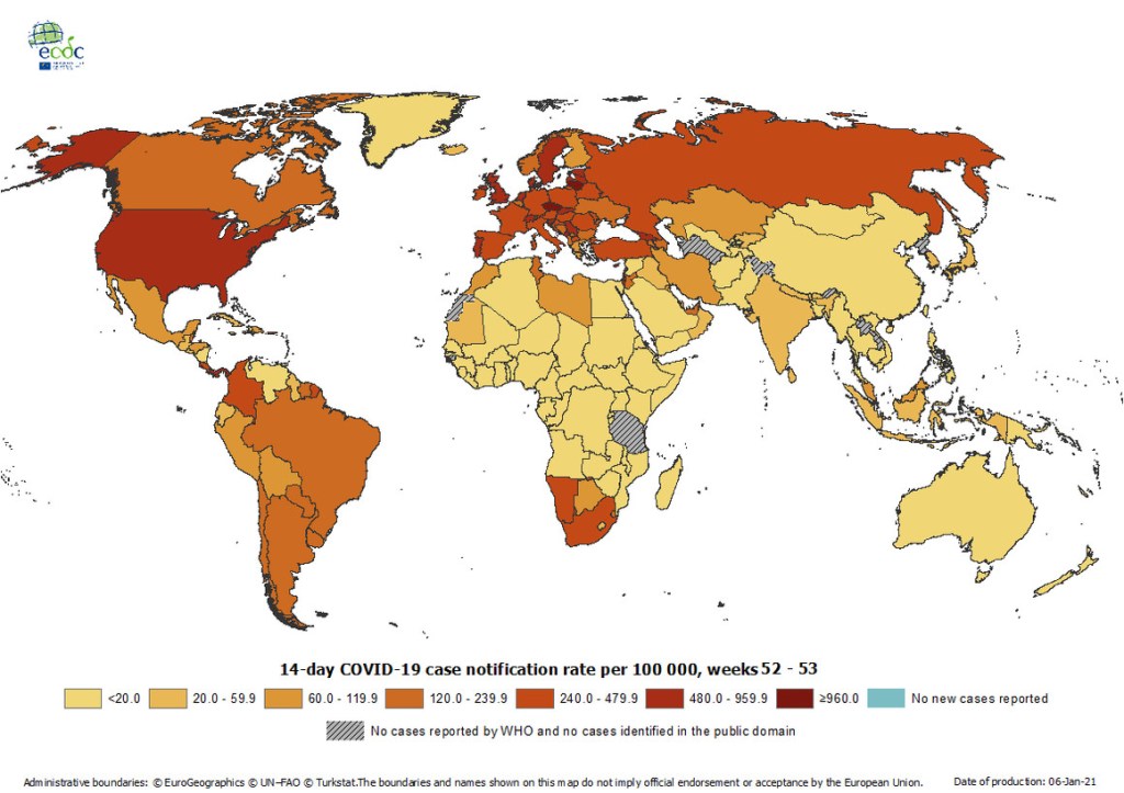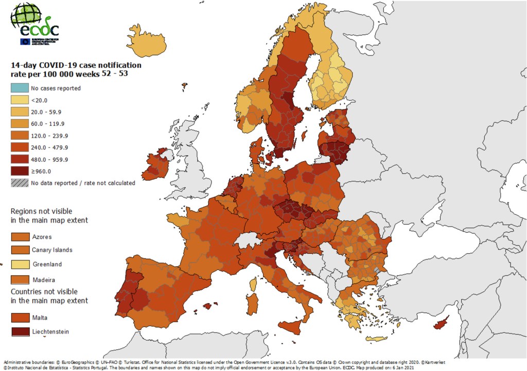 EU har ju, som jag tidigare berättat om, en kartbild över Europa där Europas regioner färgas olika mörka beroende på hur många bekräftade fall av covid-19 per 100 000 invånare som detekterats under 14 dagar. Länder som inte deltar i statistiksamarbetet är gråmarkerade. (Brexit framgår nu av kartan genom att Storbritannien nu är grått.) Du kan själv hitta kartan på nätet. Denna karta brukar uppdateras på torsdagar och avser då föregående vecka och veckan innan. Denna karta avser alltså vecka 52-53: