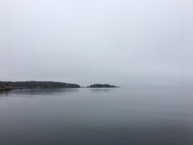 Bilden ovan som föreställer havet, himlen, en bit av kusten och Ortholmen här i Karlshamn är inte fotograferad i svartvitt. Inte heller har jag dragit ner på färgerna i efterhand. Precis så här gråa är allt för många vinterdagar i Blekinge.