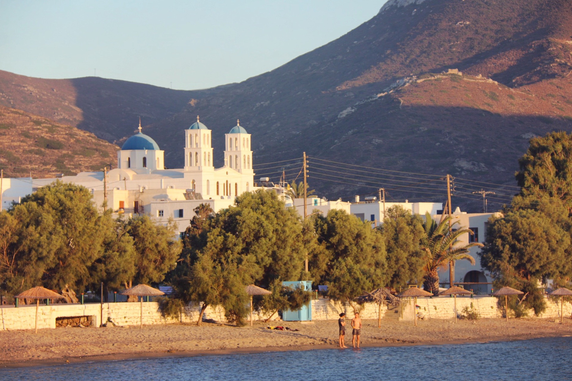 Kyrkan Ágios Geórgios och stranden i Katapola på Amorgos