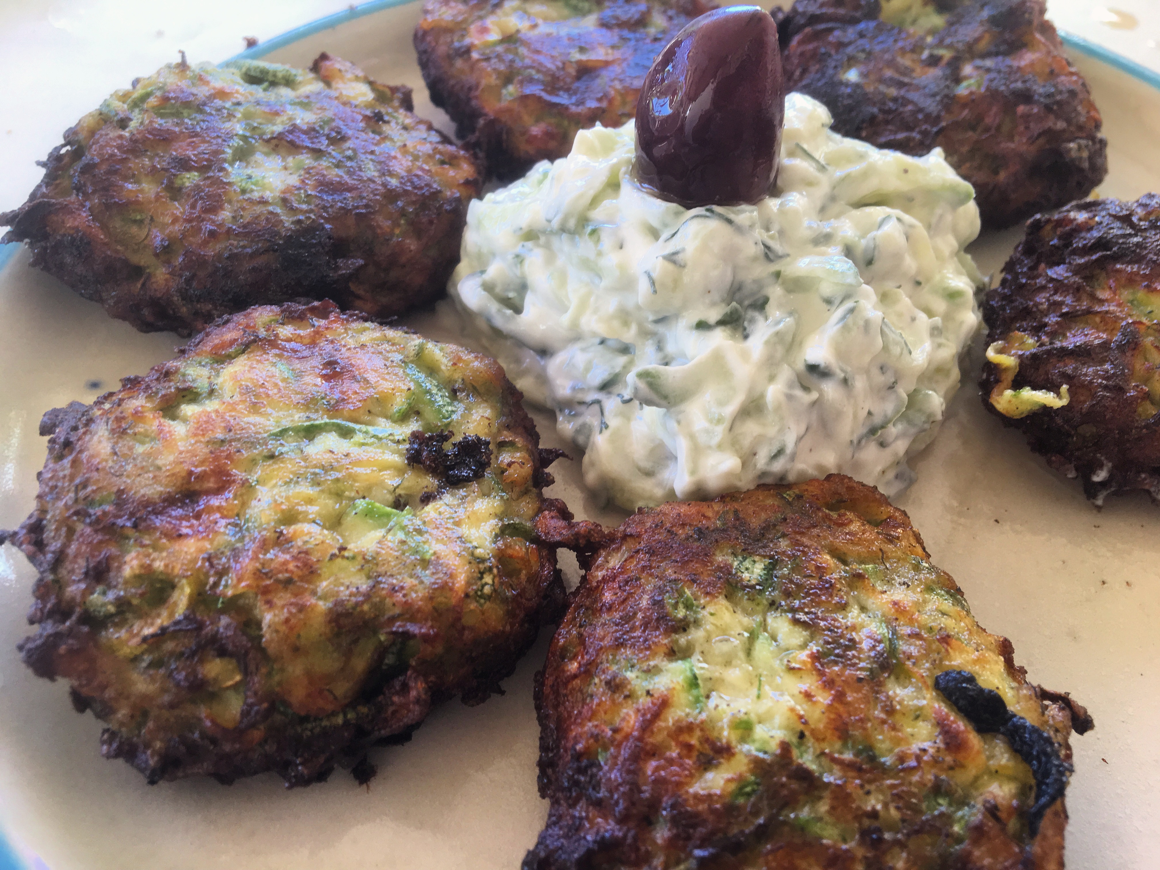 Zucchinibiffar till lunch på restaurangen Pounta i Chora, Folegandros