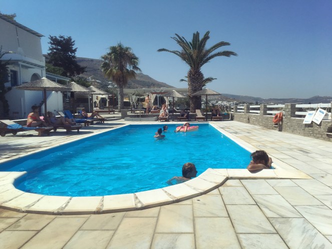 Albin och Anton badar i hotellpoolen på Pyrgaki Hotel på Paros