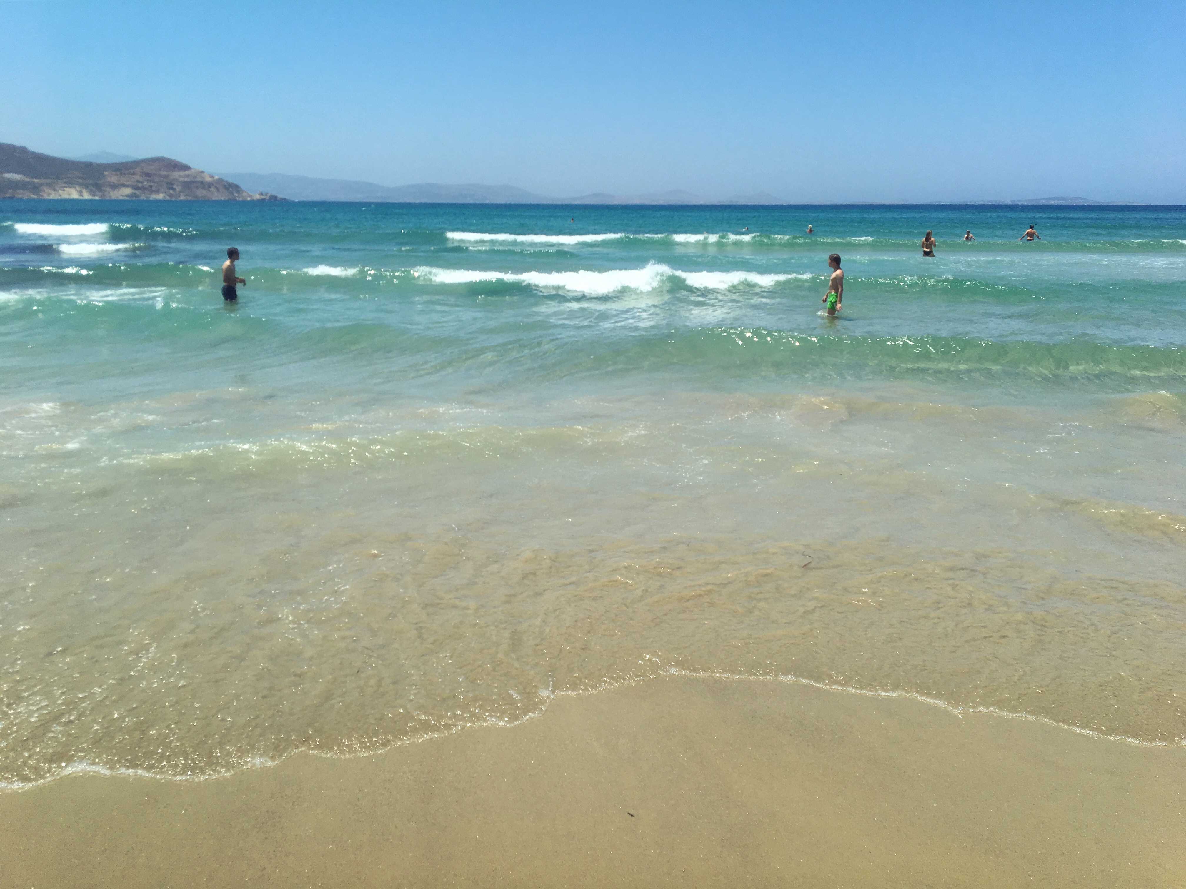 Jag och min sambo Anders har varit på Naxos förut, på en chartervecka i kombination med en vecka på Santorini. Vi känner alltså redan väl till den fina stranden Agios Georgios som ligger i de södra utkanterna av staden. Här tillbringar vi i princip hela vår dag på denna ö med sol och bad och lite promenad fram och tillbaka längs vattnet. Äter gott gör vi också. Grekisk sallad till lunch. Riktig fetaost och solmogna tomater smakar aldrig så gott som i Grekland. Under dagen blåser det upp mer och mer. Det gör just ingenting. Det är varmt i vinden och roligt att bada i de höga vågorna.